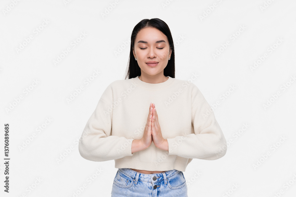 Peaceful young Asian woman girl female student practice yoga exercises praying relax meditate try to calm down zen posing isolated on white color background studio shot