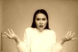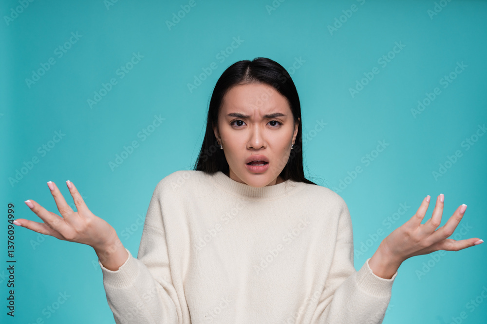 Photo of young Asian woman girl lady female student manager in casual outfit looking unpleasantly shocked, scared or worried, mouth wide open standing against blue background