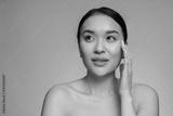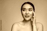 Portrait of beautiful young Asian woman girl with clean fresh skin on beige background touching her neck looking aside . Face care, facial treatment, cosmetology, beauty and spa concept