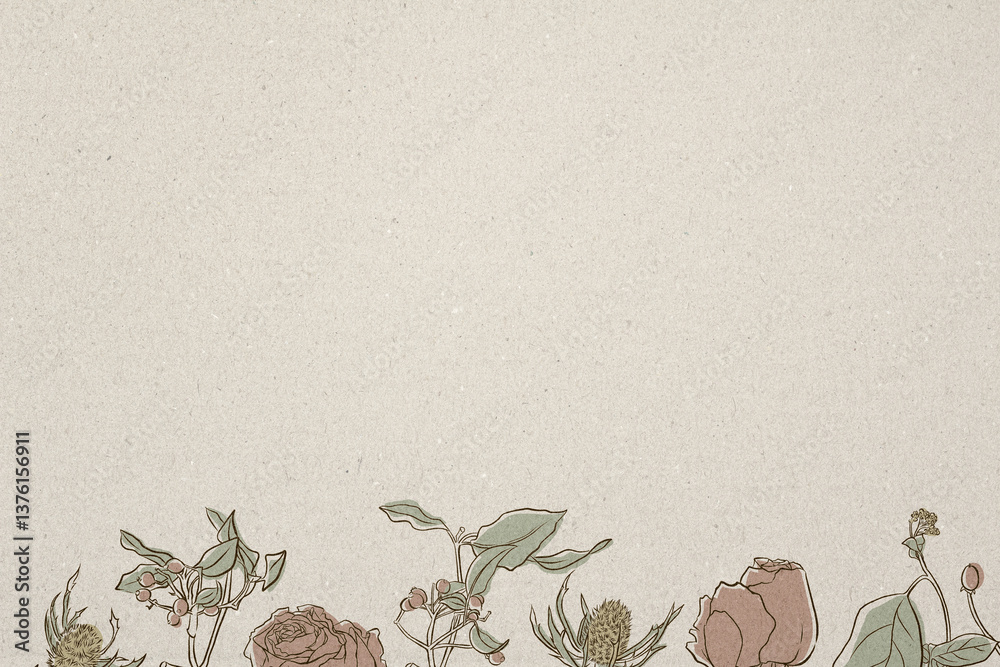 This is a pretty frame with illustrations of pink roses and plants on a cardboard background, all with an overall beige tone