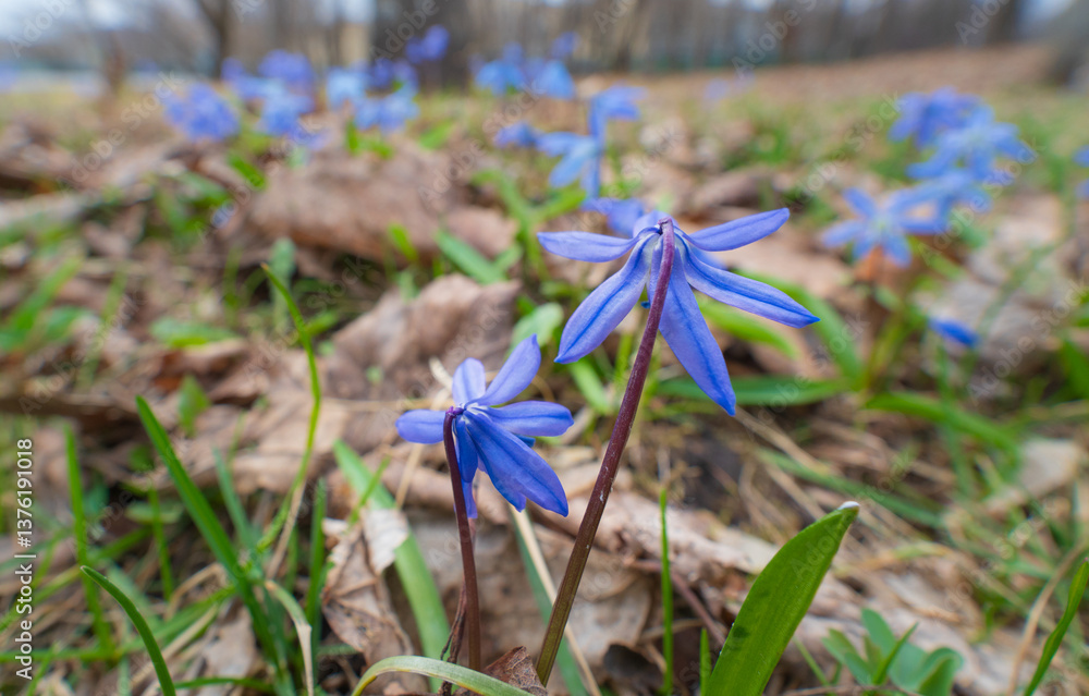 A vivid display of delicate blue spring flowers emerging amidst fallen leaves, symbolising renewal, beauty, and the transition from winter to spring in nature.