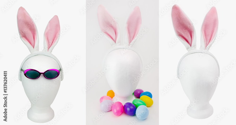 Easter styrofoam mannequin head decorations with sunglasses, colorful plastic easter eggs and furry pink bunny ears. Isolated.