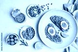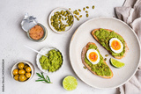 Toast with fresh avocado, eggs, herbs and seeds with lemon slices on white background. Healthy eating and wholesome Breakfast, top view