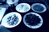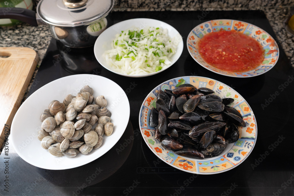 Chef preparing fresh clams, mussels, tomatoes, and onions for cooking on a ceramic hob