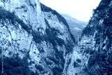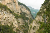 A picturesque highway with an overhead power line on poles high in the mountains along the edge of a steep cliff. A narrow canyon below.