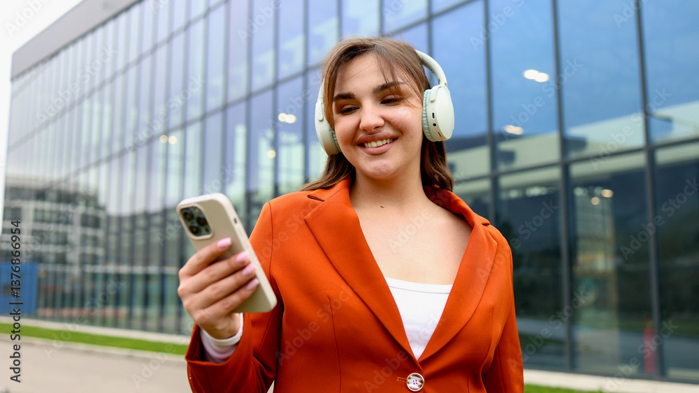 Businesswoman listening music with headphones and using smartphone in front of office building