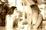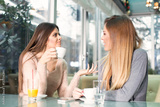 Two girls talking at cafe restaurant