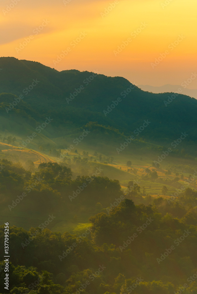 Vertical Horizon Sunset mountain range beautiful landscape mist foggy sunrise beam. Golden sky Mountain landscape mountain. Vertical Amazing Landscape cloud sky on sunrise. Gold sunlight heaven scene