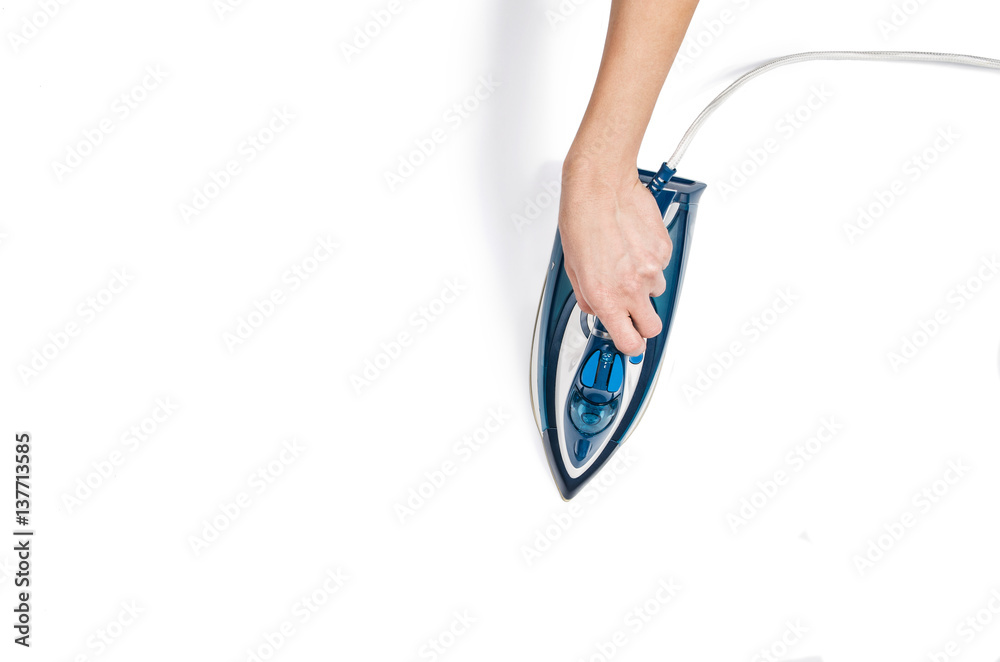 Female hand ironing clothes top view isolated on white background. Young woman seen from above during housework. Blue iron on white table.