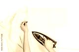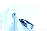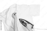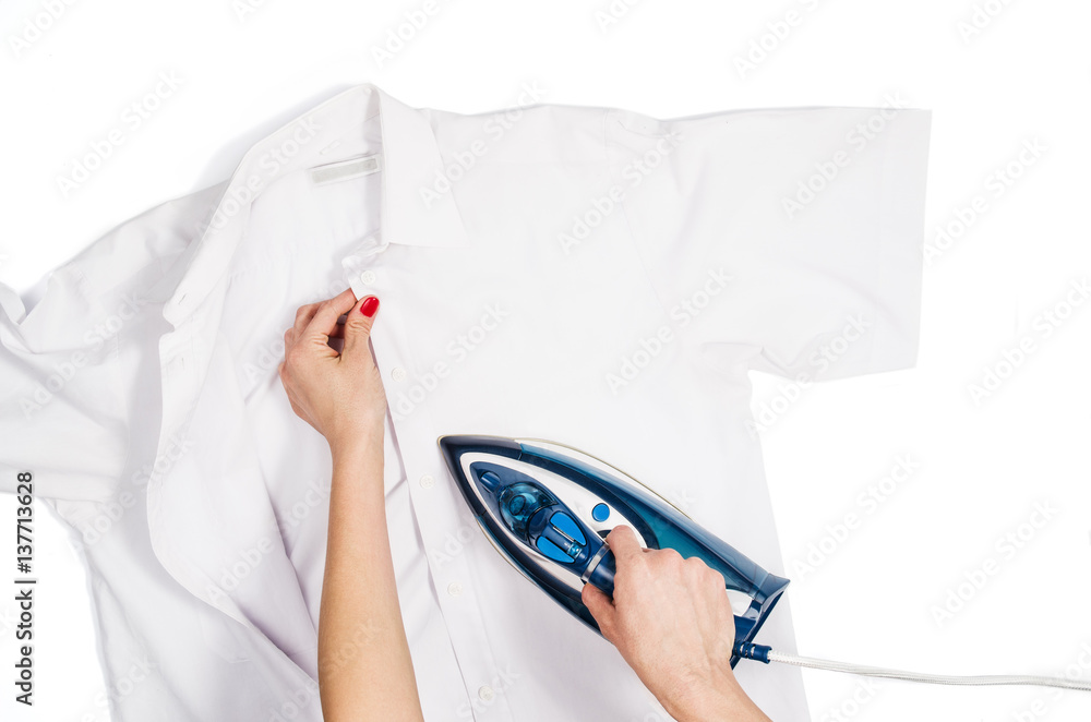 Female hand ironing clothes top view isolated on white background. Young woman with iron ironing man's shirt seen from above during housework. Blue iron on white table.