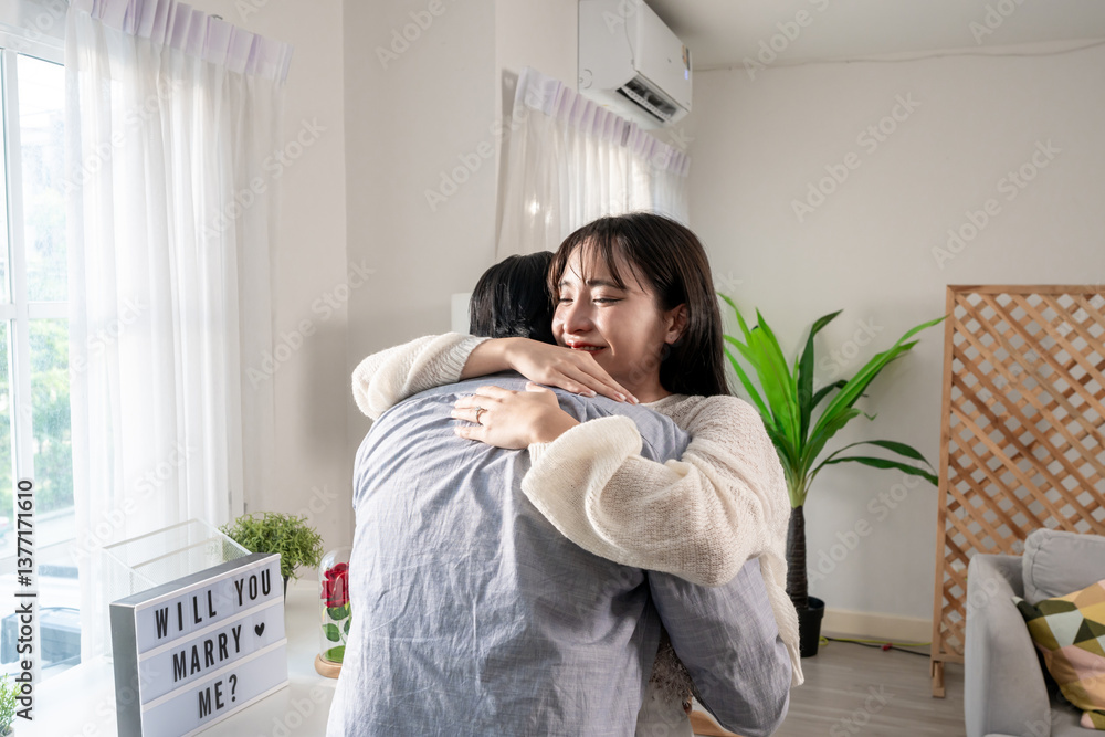 Asian romantic man surprise his girlfriend with a marriage proposal.