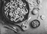 Seafood dinner. Grilled tiger prawns in cast iron grilling pan with lemon, leek, chili pepper and mint salsa sauce over grey concrete background, top view. Slow food concept