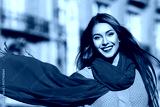 Outdoor close up portrait of young pretty happy smiling girl with long beautiful hair posing on street. Model looking at camera, wearing red scarf. City lifestyle. Sunny day. Female fashion concept
