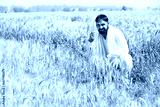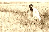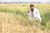 Happy Indian farmer at wheat agriculture field. Haryana man wearing traditional white cloths at farmland, People of India, Copy space.