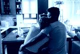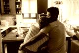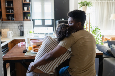 Young couple shares a tender moment at the kitchen table, hugging and enjoying a peaceful morning together in a cozy home.