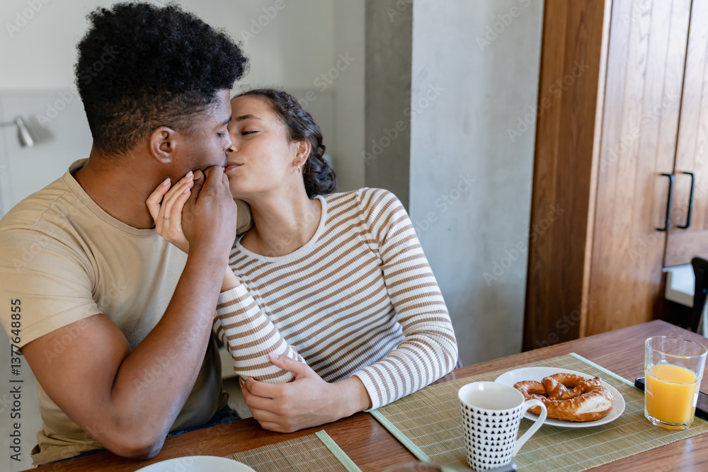 A happy couple shares a loving moment at breakfast, embracing warmly. The woman smiles with closed eyes as the man tenderly holds her hand, conveying warmth, love, and intimacy.