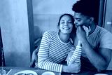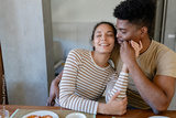 A happy couple shares a loving moment at breakfast, embracing warmly. The woman smiles with closed eyes as the man tenderly holds her hand, conveying warmth, love, and intimacy.