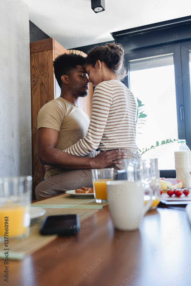 A young couple shares a loving embrace in a cozy kitchen, foreheads touching as they enjoy an intimate moment. A breakfast table with milk and fruit is visible in the foreground.