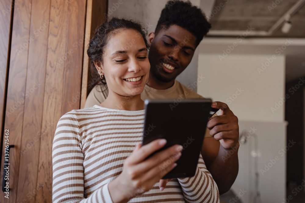 Happy couple shopping online together at home using a tablet and credit card, enjoying modern technology and convenience.