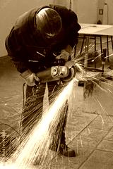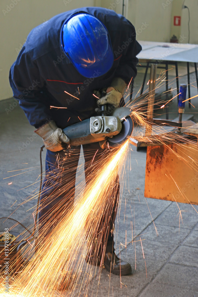Worker grinding a metal part with grinding wheel, lots of sparks in factory
