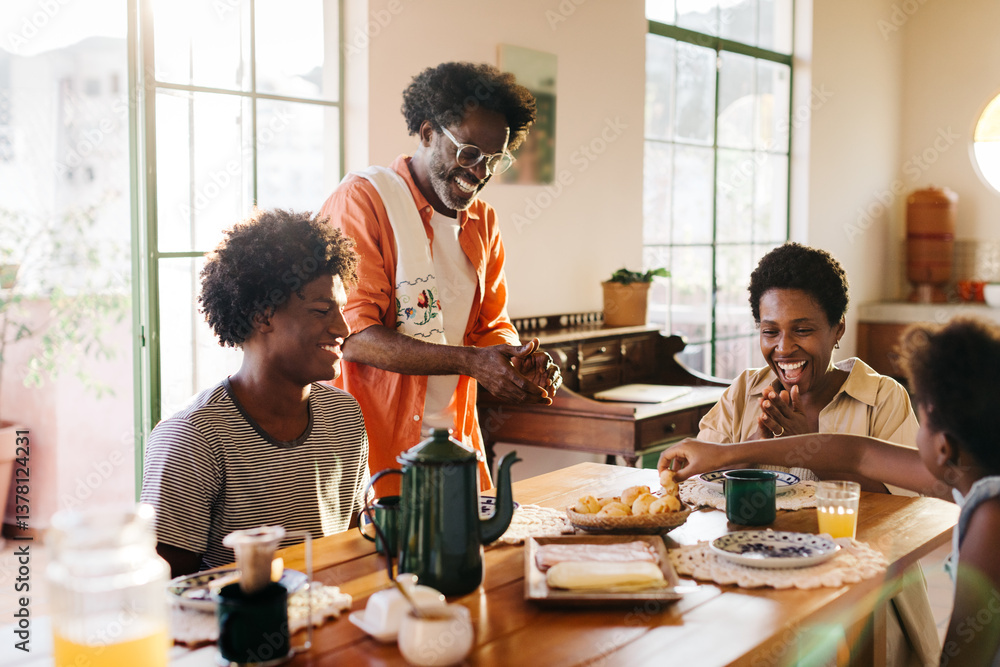 Happy family digs in to delicious pão de queijo breakfast prepared by dad at home