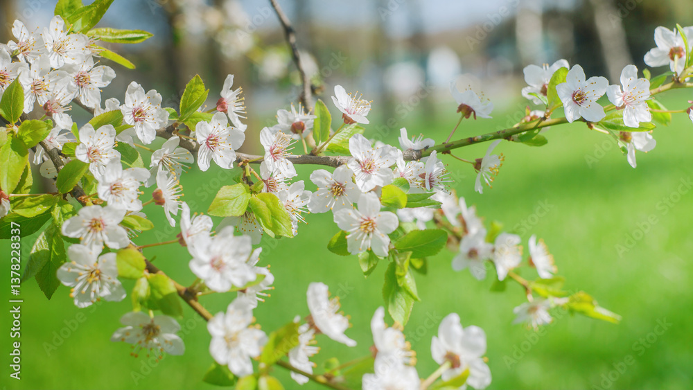 White cherry flowers on bright nature background with green grass. Blooming cherry tree branch in spring. Spring floral banner. White cherry flowers close up. Spring wallpaper.