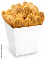 Palmiers Recipe or Puff Pastry Dough in paper bucket isolated on white background, Butterfly Pie on white With clipping path.