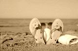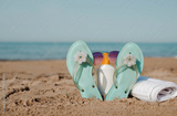 Summer beach essentials with flip-flops, sunscreen, and towel