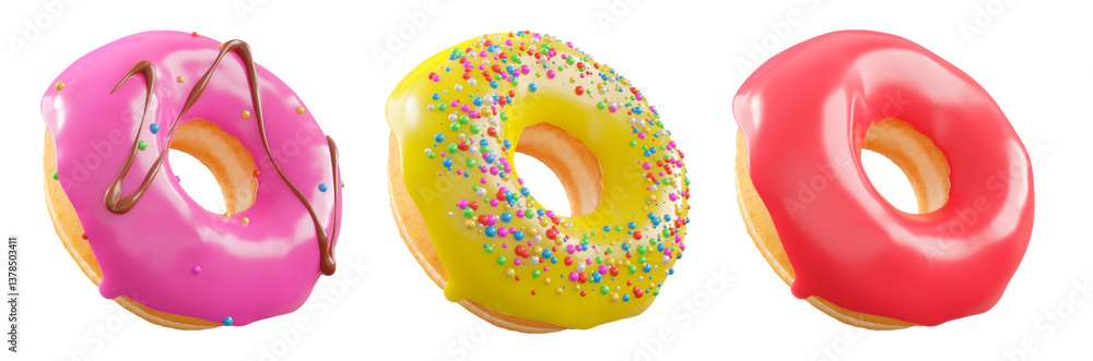 Donuts with yellow lemon glaze, sprinkles, white drizzle, and dots isolated on white transparent background. 3d rendering and illustration of dessert variety