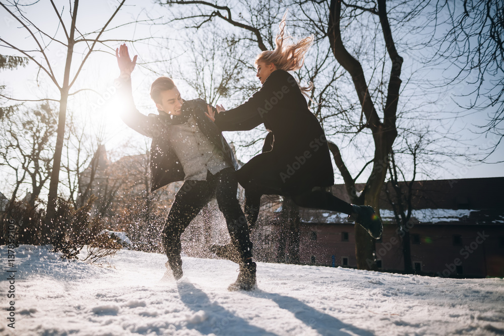 Love hipster couple man and woman with black clothes walking in the city and fun to spend time