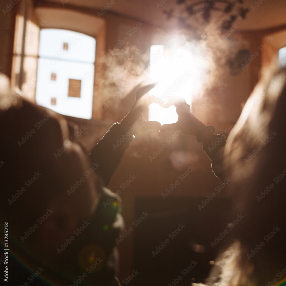Loving couple making hands silhouette in heart shape for sunlight