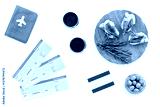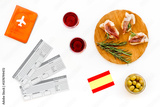 Travel to Spain. Passport and airplane tickets with traditional Spanish meal
