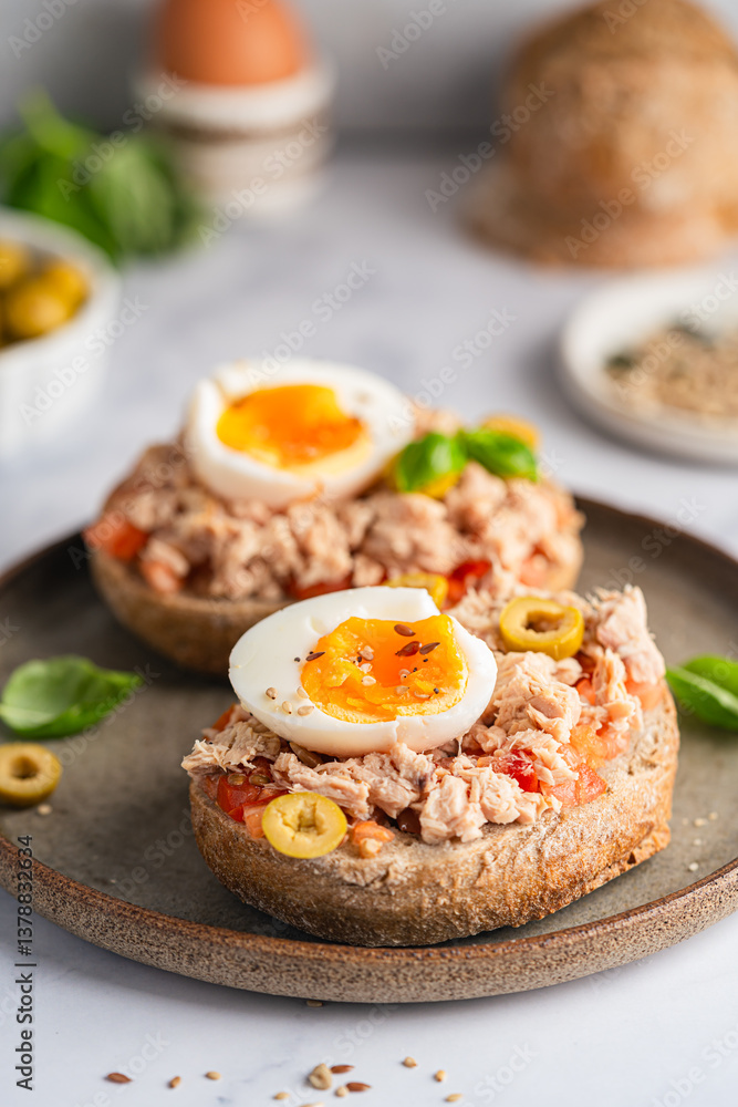 Tuna toast. Open sandwiches with whole grain bread, canned tuna, boiled egg, tomatoes and olives on white background. Healthy breakfast food