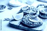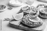 Toast with avocado, feta cheese, eggs, herbs and seeds with lemon slices on white background. Healthy eating and wholesome Breakfast
