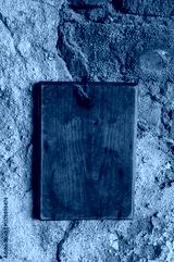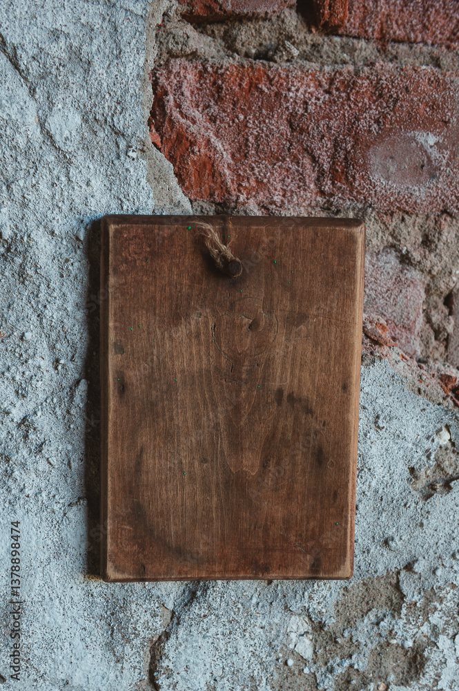 Old wooden blank signboard on the aged cement brick wall background