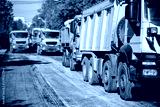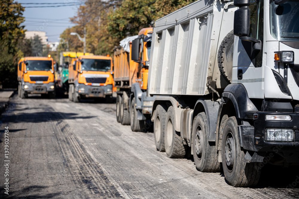 Trucks lined up on a bustling city street creating an industrious atmosphere in the afternoon sunlight