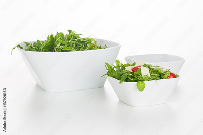 Arugula salad in square bowls isolated