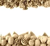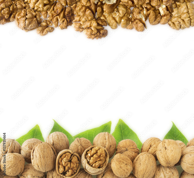 Walnuts background. Walnuts with leaves at border of image with copy space for text. Kernels walnuts on a white background. Top view. Vegetarian or healthy eating.
