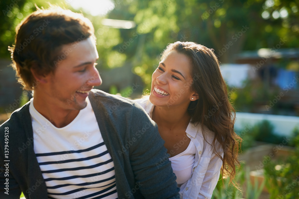 Couple, home and happy in garden on break with fun, laughing and bonding for love in Spain. People, relationship and outside with smile for nature at backyard for support, care and trust as lovers