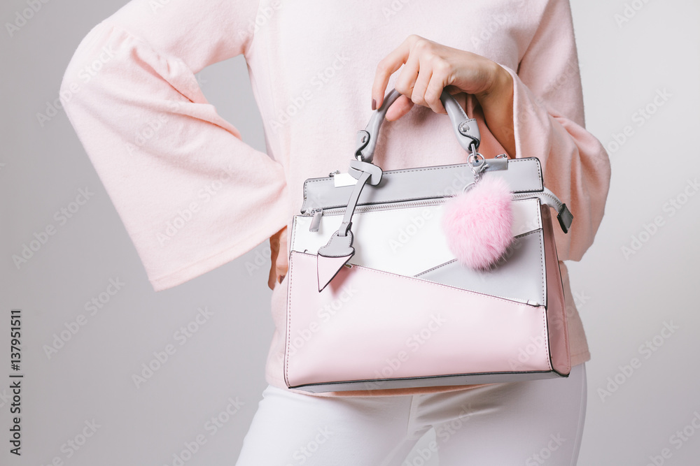 Elegant outfit. Female fashion. Girl in fashionable clothes holding bag handbag.