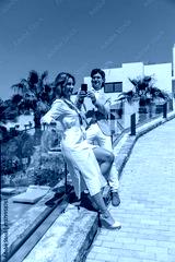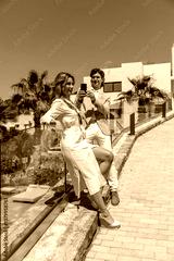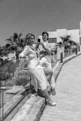 Man photographing his girlfriend with a phone outdoors