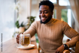 Close up portrait of young black man who is sitting at bar and drinking tea. Selective focus on drinking glass.