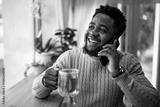 A young black man sits at the bar, casually dressed. He is talking on phone and drinking tea.