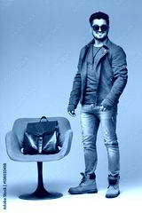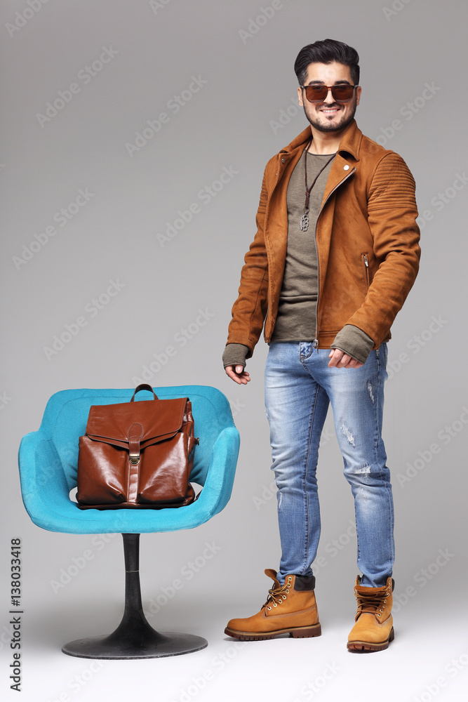 Handsome young man posing. Jacket, boots, jeans, sunglasses.