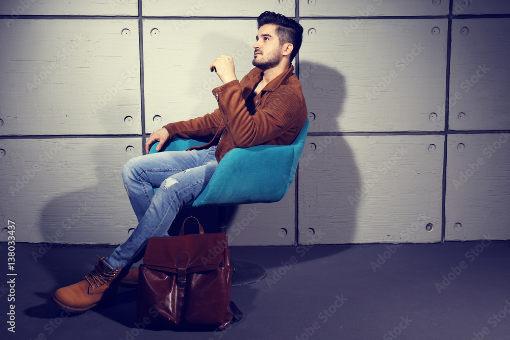 Handsome young man posing. Jacket, boots, jeans, sunglasses.