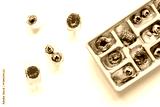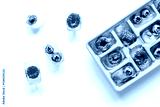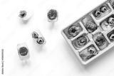 Icecubes with icetray and berries on white background top view