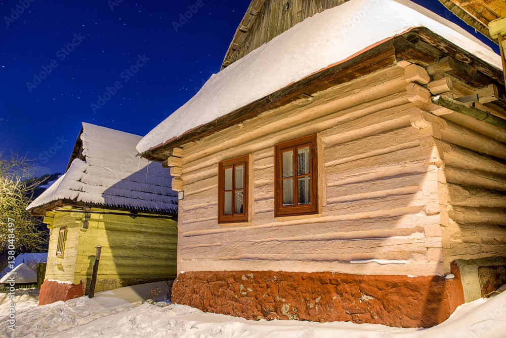 Cottages in UNESCO village Vlkolinec at winter night, Slovakia
