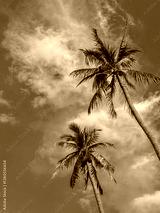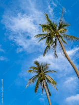 Tall coconut palm trees sway against a bright blue sky with wispy white clouds. A tropical and relaxing scene that evokes summer vibes and island getaways.