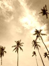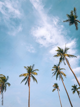 Tall coconut palm trees sway against a bright blue sky with wispy white clouds. A tropical and relaxing scene that evokes summer vibes and island getaways.