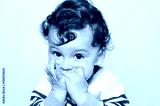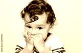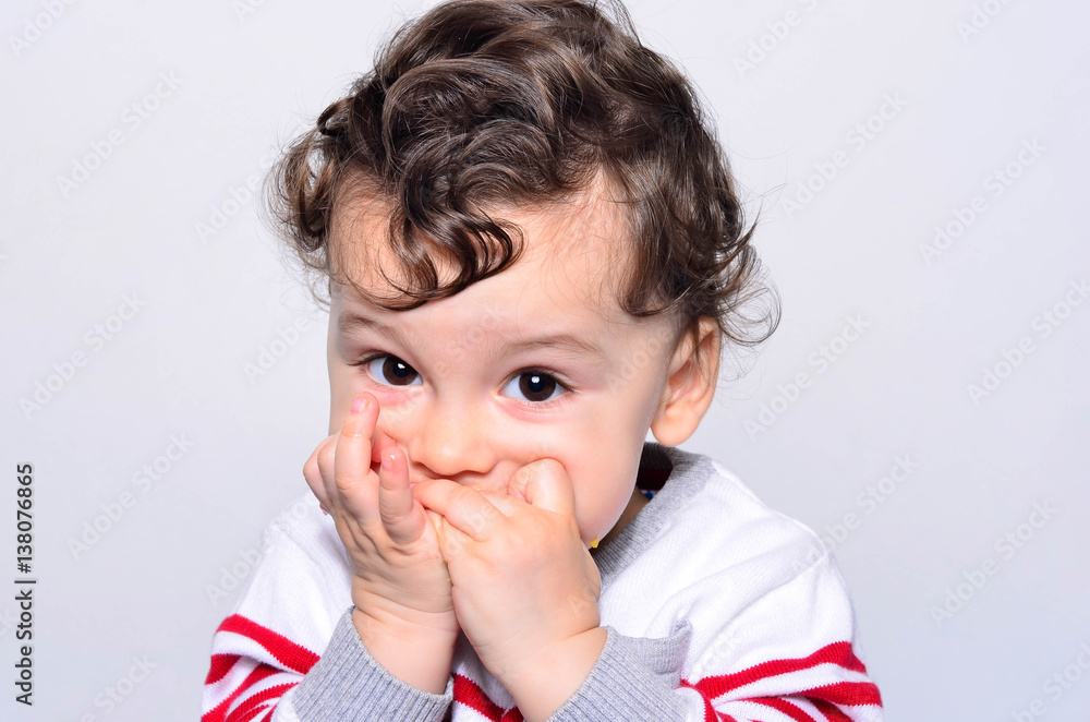 Portrait of a cute baby eating orange. One year old kid eating fruits by himself. Adorable curly hair boy being hungry biting on a slice of orange.
